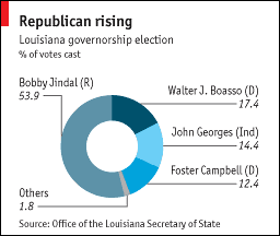 Atop the scorecard is the Republicans' reclamation of the governorship, in a rare primary-election victory by the 36-year-old Bobby Jindal on October 20th. Unusually, Louisiana holds a combined primary for all candidates, Democrat and Republican, with the top two vote-winners going forward to a run-off. Even more unusual is for a candidate to win outright on the first round, which is what Mr Jindal managed, polling an impressive 54% of the primary vote. Perhaps most remarkable of all is that Mr Jindal, who is Indian-American as well as very young, has overturned what had been supposed to be deep-seated prejudice. Four years ago, his defeat by Ms Blanco was widely viewed as proof that the state's “Bubbas”—rednecks uncomfortable with politicians who don't look like them—had not evolved.