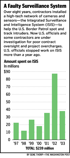 Near Buffalo, IMC billed the government for 59 cameras but only four were installed, and in Naco, Ariz., unassembled high-tech gear was found lying in the desert, the report said. "No IMC personnel had been on-site since the equipment was delivered" in 2003, the report added.